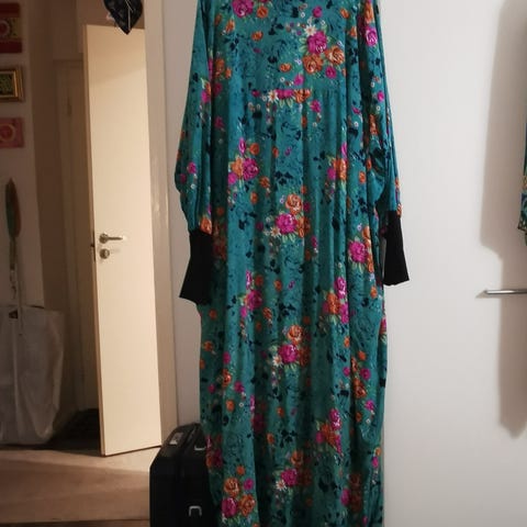 Musliminaisen rukousmekko. Kevyttä ja liukuvaa materiaalia. Väljä malli - one size. Kauniit hihat ja mekossa on kiinni huivi. Käytetty muutamat kerrat. Katso myös toinen myynnissä oleva rukousmekko.