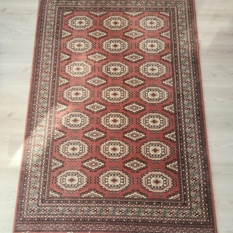 Kaunis perinteinen itämainen kuviointi, lämmin beige pohjaväri ja punasävyinen reunus. Sopii erinomaisesti olohuoneeseen tai ruokapöydän alle.