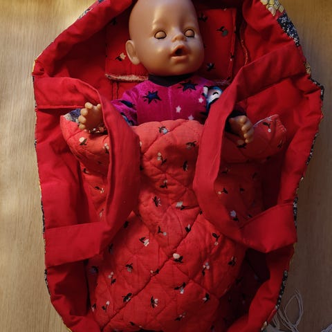 Baby Born nukke ja makuupussi. Nukke on vauvanukke, jolla on vaaleanpunainen, kuviollinen makuupussi vetoketjulla ja nyörikiristyksellä. Makuupussissa on pupukuvio ja tekstiä sekä Baby Born -logomerkki. Soveltuu lasten leikkeihin vauvanuken hoito- ja nukkumisleikkeihin.