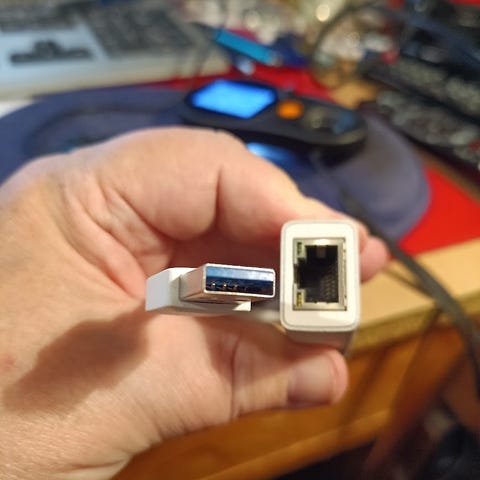 Liitännät: USB-C (uros) ja RJ45 (naaras).