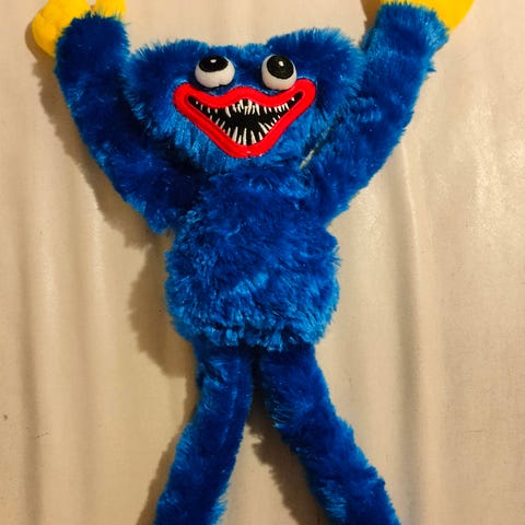 Myydään Poppy playtime -nimisestä pelistä tuttu Huggy Wuggy -pehmoleluhahmo ja reppu.