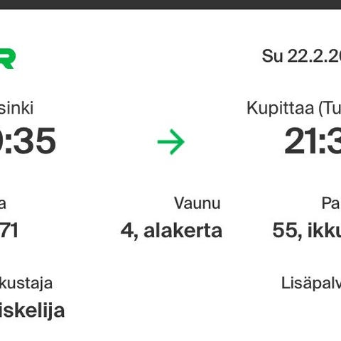 VR Aikuisen junalippu tänään 13.2. Jämsä / Tampere -Helsinki