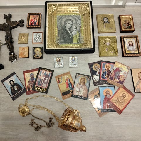 Kolme erilaista ikonia, joissa on uskonnollisia kuvauksia. Keskimmäisessä ikonissa on Kristuksen kuva. Vasemmanpuoleisessa ja oikeanpuoleisessa ikonissa on muita pyhiä hahmoja.