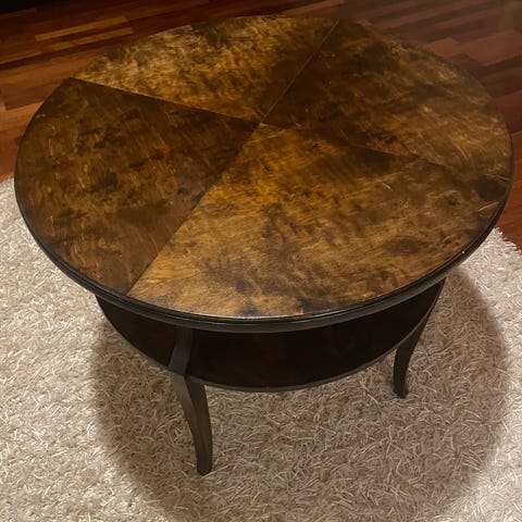 Pöydässä on havaittavissa kulumista ja naarmuja, erityisesti kulmissa ja reunoissa. Toisessa lasissa särö.