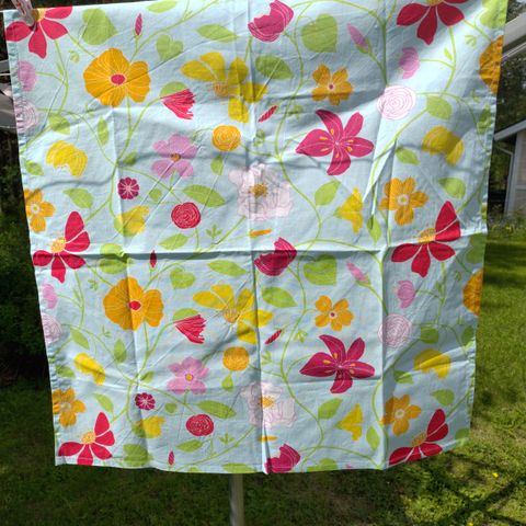 Finlayson pöytäliina, jossa on graafinen voikukkakuosi harmaan ja keltaisen sävyissä valkoisella pohjalla. Kuosissa on erikokoisia, pyöreitä kukkakuvioita, jotka luovat selkeän ja modernin ilmeen. Materiaali on sileää kangasta, jossa on Finlayson-merkki sivussa.