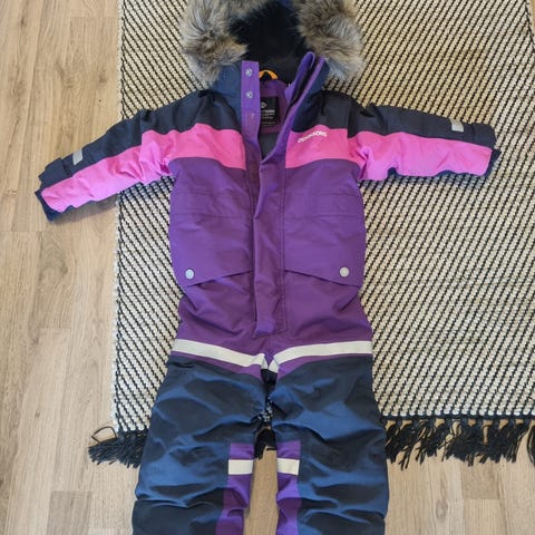 Lämmin Didriksons asu pienelle. Ehjät ja siistit. Kirkkaat värit. Ei pehmentymää polvissa eikä pepussa! Takki ja henkselihousut. Koko 90cm, meillä oli käytössä 100cm asti. Sopivan paksu ja lämmin pakkasille, muttei estä liikkumista. Hyvät taskut, heijastimet ja huppu. Vetoketjut ehjät! Takissa kiristys ja hihoissa hyvät resorit. Housuissa jalkalenksut hieman löystyneet. Puntit mukavan leveät jotta lapsi saa itsekin puntin kengän päälle.