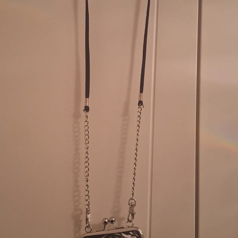 Uudenveroinen musta-valkoinen kännykkälaukku. Käy myös lapsen laukuksi. Koko 11x18x2, hihna 100 cm. Samsung A56 5G kännykkä mahtuu laukkuun.