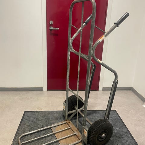 Vihreä metallinen kaksipyöräinen käsikärry. Runko putkirakenteinen ja varustettu leveällä lastausalustalla. Kahvoissa on punaiset muoviset kädensijat. Renkaat ovat ilmakumirenkaat, jotka soveltuvat erilaisten kuormien, kuten laatikoiden ja säkkien, siirtämiseen pihalla tai varastossa.