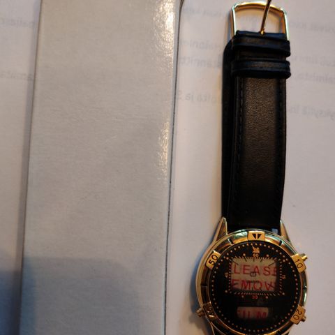 Rannekello, jossa on musta nahkaranneke ja vaalea kellotaulu. Kellotaulun kehys on metallinvärinen. Sopii arki- ja juhlakäyttöön. Ranneke kiinnittyy perinteisellä soljella.