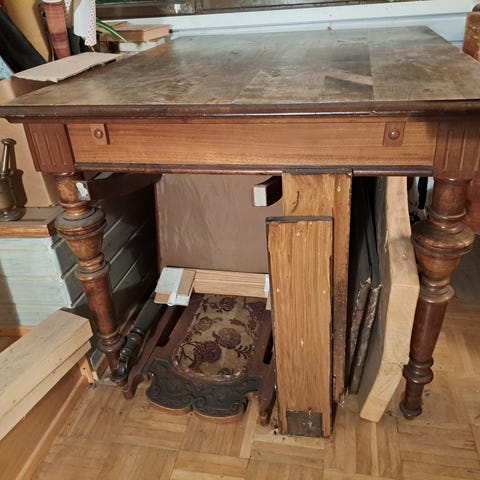 Puinen neliönmuotoinen pelipöytä, jossa keskiosassa vihreä huopapinta kortti- tai lautapelejä varten. Pöydässä on koristeellinen jalusta ja pyöristetyt kulmat. Pöytälevy on puuviilua, jossa näkyy käytön ja iän tuomaa kulumaa ja naarmuja. Soveltuu esimerkiksi peli- tai seurustelupöydäksi sisätiloihin.