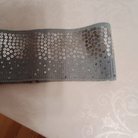 Leveys n. 26,5 cm (ympärysmitta tämä kerrottuna kahdella) ja korkeus n. 9 cm. Joustavaa kangasta