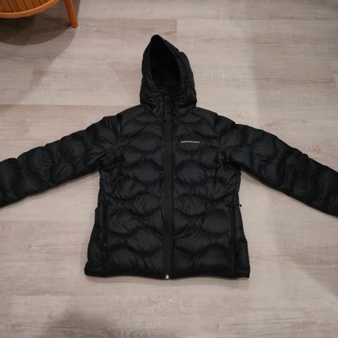 Peak Performance naisten talvitakki, koko M. Pitkä, musta takki, jossa tikattu, untuva täyte.