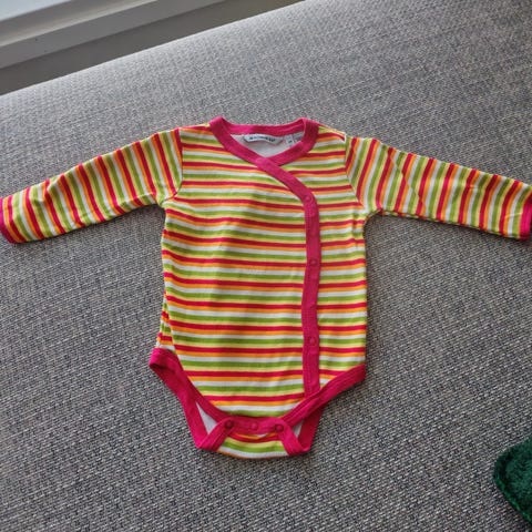 Marimekko vauvan body, koko 68. Pitkähihainen unisex-mallinen body, jossa punavalkoraidallinen, kirjava kuosi. Materiaalina puuvilla. Siistissä, käytetyssä kunnossa, ei näkyviä tahroja.