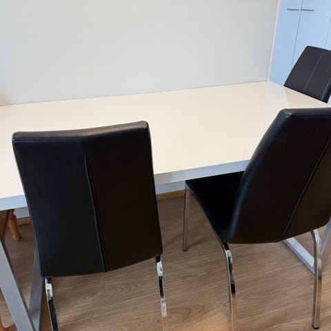 Siistissä kunnossa oleva ruokaryhmä, jotain käytönjälkiä on ja tuoleissa hieman tummentumaa.