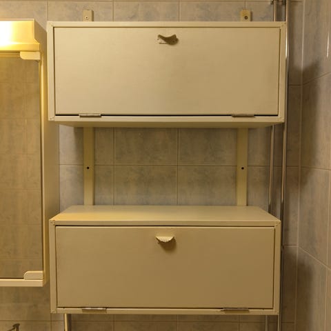Metallinen valkoinen kaappi hyllyillä, lukittava