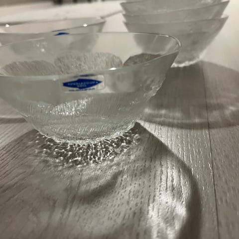 6kpl Nuutajärvi Pioni lasiset jälkiruokakulhot. Kulhojen halkaisija 12,2cm. Kahdessa kulhossa on vielä tarra jäljellä. Kaikissa kulhoissa on pieni kaiverrus, mistä viimeinen kuva. Kulhot ovat ehjät ja erittäin hyväkuntoiset.