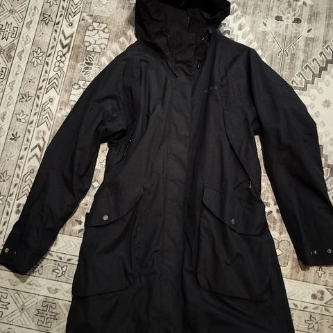 Didriksons takki, malli Ilma. Koko 48, kapeahko malli. Kainalomitta 62, pituus edestä noin 94. Haalistumaa hihansuussa, katso kuva. Väri tummansininen.