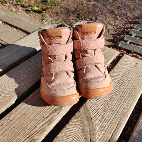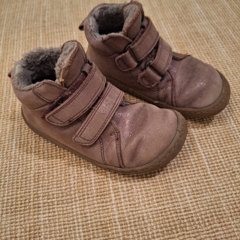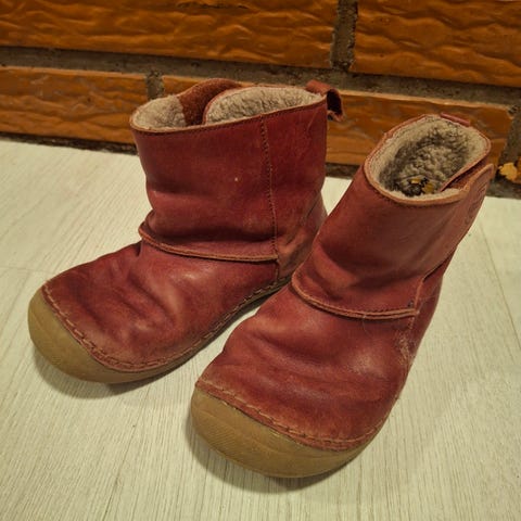 Tummansiniset Froddo nahkakengät, koko 27, tummansinistä nahkaa. Ehjät mutta jonkin verran kulumaa nahassa ja tikkauksissa sekä tummentumaa pohjallisissa. Tarrat pitää hyvin eli edelleen hyvät käyttökengät.