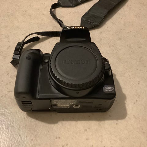 Kamera on ostettu ilmestymisvuonna 2005, ja laukaisin lukumäärä on noin 19200. Linssin ostin käytettynä joskus myöhemmin. Rungossa on kulumista, ja etsimestä puuttuu pehmustekumi. Mukaan tulee laturi ja tarvikeakut, jotka ostin vuonna 2008 ja 2020. Otin yhden testikuvan, ja näytti toimivan. Tuotteille ei takuuta, ja toimituskulut ostajalle.