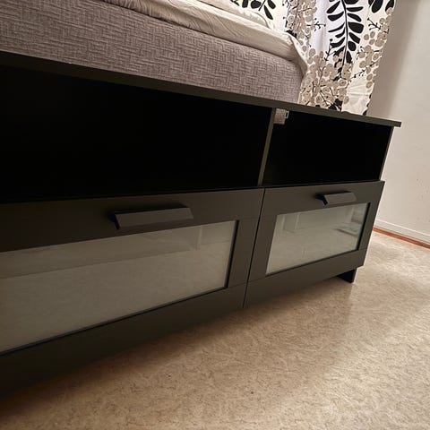 IKEA tv-taso. Vaaleasävyinen puujäljitelmäkansi ja -runko, valkoiset ovet molemmissa päissä. Keskellä avoimet hyllyt medialaitteille, takana läpivienti johdoille. Molemmissa päissä ovien takana hyllylliset säilytyslokerot. Soveltuu television ja viihdelaitteiden sijoittamiseen sekä säilytystilaksi olohuoneeseen.