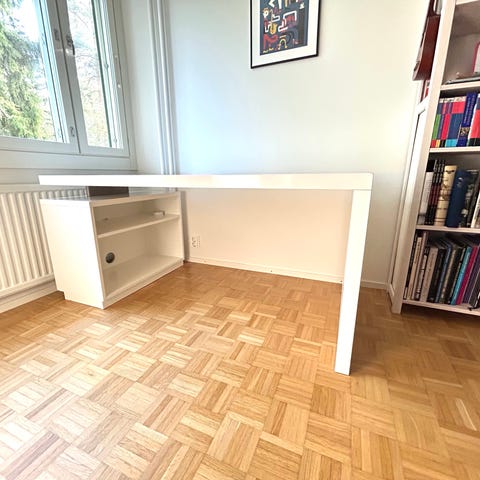 Huippusiisti Muurame työpöytä pähkinä L-tasolla ja valkoisella kaapilla.