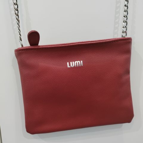 Lumi-olkalaukku on valmistettu punaisesta nahasta, jossa on kevyt pintakuviointi. Laukussa on hopeanvärinen ketjuhihna, joka toimii olkahihnana tai tuplattuna lyhyempänä. Pussimallinen laukku sulkeutuu vetoketjulla, ja etuosassa on tunnusomainen LUMI-logo.