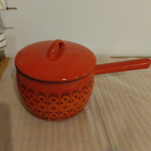 Finel punainen kasari. Uudenveroinen niin sisältä kuin ulkoa, koko on ehkä 2-2,5L. Korkeus noin 12cm ja halkaisija noin 15cm