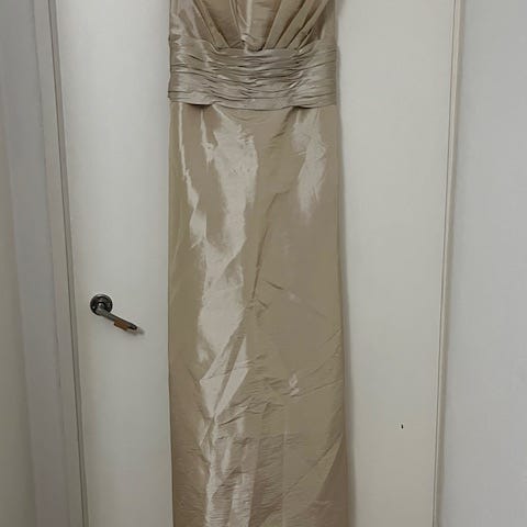 Täyspitkä kaunis iltapuku, vuorillinen ja tyllialushameellinen. Koko 36-38 (säädettävissä nyöreillä takana), takana myös lyhyt vetoketju. Käytetty muutamia kertoja.