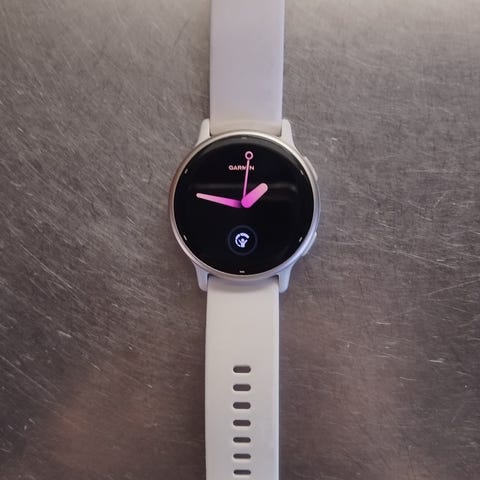 Erittäin hyvässä kunnossa oleva Garmin Vivoactive 6. Akku edelleen hyvässä kunnossa (lataan kerran viikkoon, joka kerta yli 30% jäljellä). Ei naarmuja eikä kolhuja ja ranneke hyvässä kunnossa.