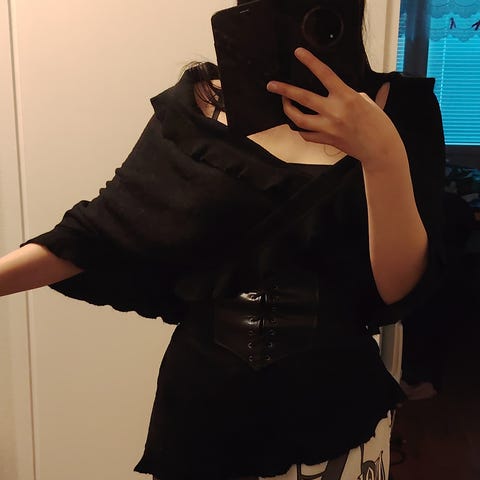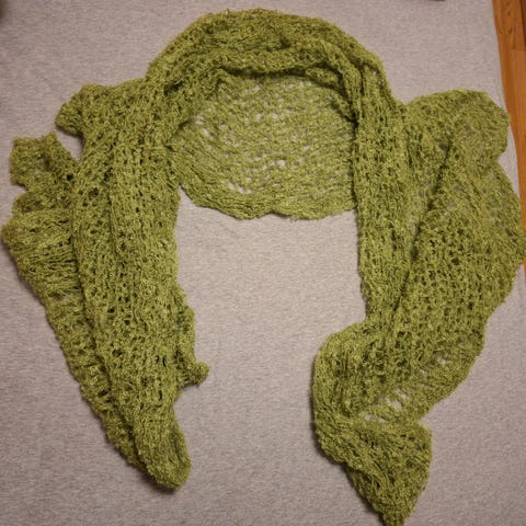 Shaalin väri on voimakas okra, muotoonommeltu neule. Isokokoinen suorakaiteen muotoinen ohut neule, jossa halkio. Se on tarkoitus heittää huolettomasti olan yli esimerkiksi takin päälle, jolloin se laskostuu sievästi. Röyhelömäinen reuna ommeltu koneellisesti. Keinokuitua.