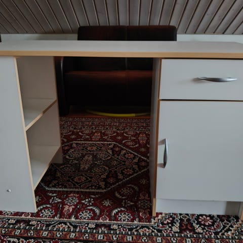 Musta tyylikäs työpöytä, lasikansi, 4 laatikkoa, rullat alla. Liian suuri itselleni.