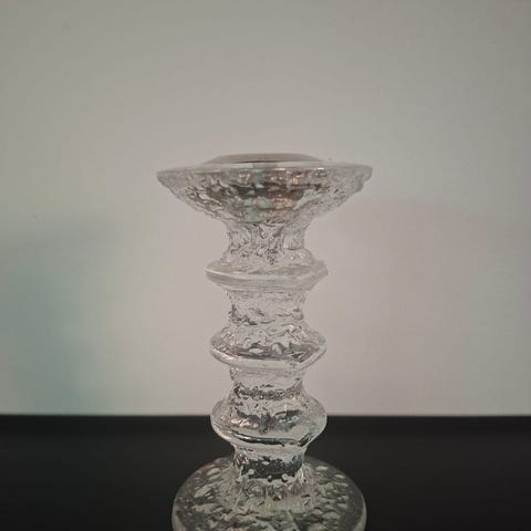 Timo Sarpanevan suunnittelema klassinen Iittala Festivo -kynttilänjalka, joka tunnistetaan sen rosoisesta, jäätä muistuttavasta lasipinnasta.