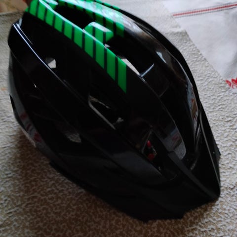 Kaksi lapsilla käytössä ollutta kypärää. Menee myös luistelussa. Vihreässä kypärässä ei säätönahdollisuutta. Mustassa on,mahtunut myös aikuisen päähän.
