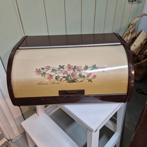 Vanha Valkoinen metallinen leipälaatikko, jossa rullakansi. Etuosassa sinisävyinen koristekuvio on vähän kulunut. Takana ja pohjassa tuuletusaukkoja, jotka auttavat pitämään leivän kuivana. Soveltuu leivän ja muiden kuivaelintarvikkeiden säilyttämiseen keittiössä pöydän tai työtason päällä. lev. 39 cm, kork 17 cm, syv. 25 cm.