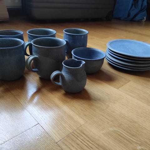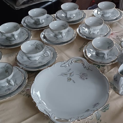 Myytävänä yhdeksän kuppia lautasineen, sokerikko ja kermakko.