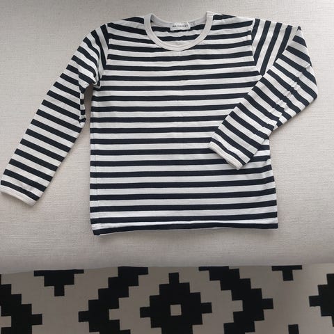 Marimekko pitkähihainen trikoopaita. Koko 122. Tasaraita / raitapaita, raidat harmaita ja mustia. 100% puuvillaa. Nimikoitu tarralla (jonka saa irti pesulapusta). Siisti ja ehjä. Eläimetön ja savuton koti Koivistonkylässä Tampereella. Tuoksuttomat pesuaineet käytössä.