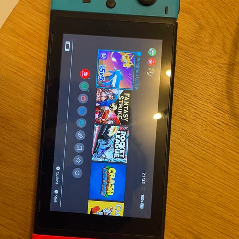 Nintendo Switch -pelikonsoli. Mukana telakka ja virtalähde, kuvissa näkyvät keltainen/pinkki Joy-Con -ohjaimet ja 256gb muistikortti. Konsoli luonnollisesti tyhjennetään ennen myyntiä.