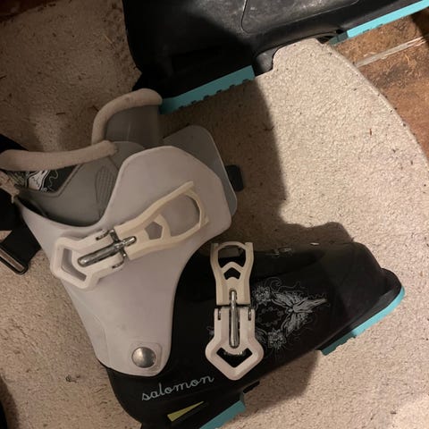 Salomon laskettelumonot, koko 27.0 (noin EU 42, UK 8). Väri musta harmailla ja hopeanvärisillä yksityiskohdilla. Monossa useampi solkikiristys ja takaa kiristyshihna, jotka auttavat säätämään istuvuutta. Pohjissa vaihdettavat kulutuspalat. Soveltuvat lasketteluun standardeihin alppisiteisiin yhteensopivina.