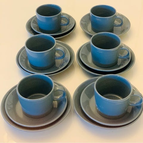 Arabian expresso/mokkakahvikupit. Ruusukuviot ja vihreät raidat. ||-laatua joten valmistuksessa tulleita virheitä. Yhden lautasen reunassa erittäin pieni kolhu. Yhden kupin sisäpuolella hieman tummaa. Muuten täysin ehjät. Kupin korkeus 4.5cm, tilavuus vajaa 1dl. Lautasen halkaisija 11cm.Näitä kaikkiaan 6kpl. Hinta yhteensä 7€.