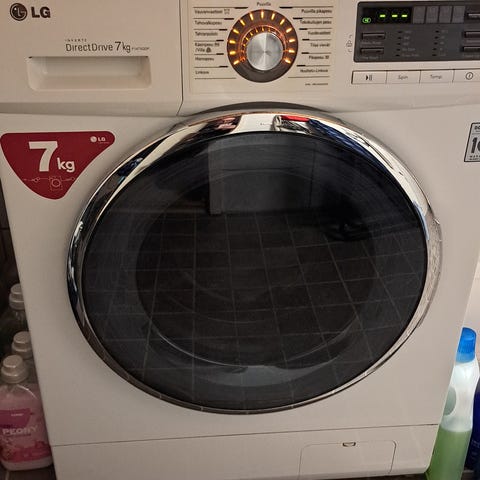 LG edestä täytettävä pesukone valkoisella rungolla. Laitteessa on suuri etuluukku ja digitaalinen näyttö, josta voi valita erilaisia pesuohjelmia ja säätää asetuksia. Ohjauspaneelissa on ohjelmavalitsin, painikkeet lämpötilalle, linkoukselle ja lisätoiminnoille sekä näytöllä näkyvä jäljellä oleva pesuaika. Pesukone soveltuu arkikäyttöön erilaisten tekstiilien pesuun kotitalouksissa.