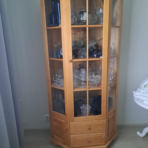 4 tukevaa puuhyllyä, lasiovet.