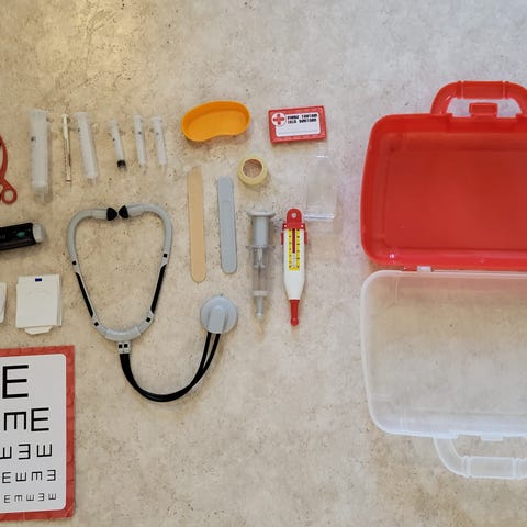 Myydään kuvan lääkärinlaukku hedelmineen, joita voi puolittaa.