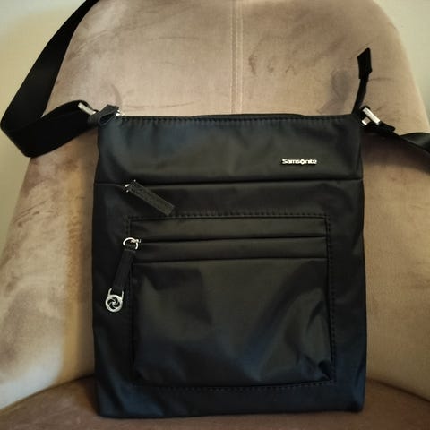 Tämä on uusi. Koko on että puolen litran vesipullo mahtuu hyvin. Samsonite laatua. Paljon lokeroita ja vetoketjutaskuja. Omaan käyttöön liian pieni olkalaukku.