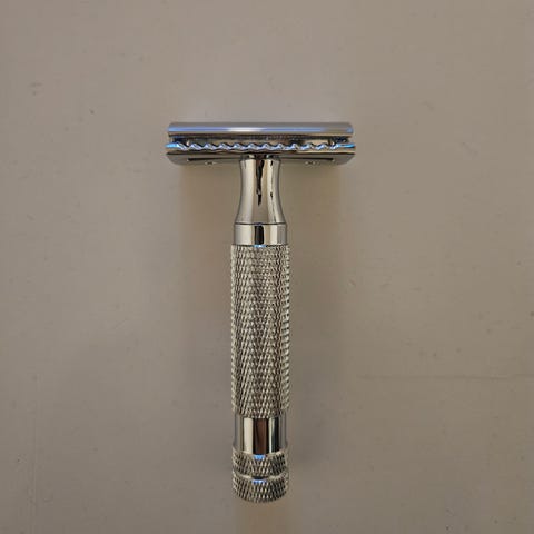 Aikalailla Merkur 34C:n kokoinen, mutta huomattavasti painavampi materiaalista johtuen. Pysyy kädessä mukavasti "Sure Grip" varren ansiosta.