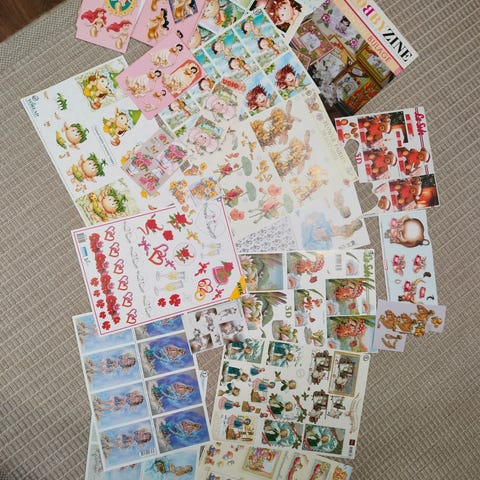 Iso setti decoupage tuotteita: riisipaperia, kuvia, paperiliinoja...