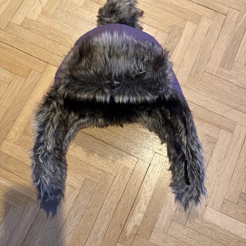 Hyväkuntoinen karvahattu koko 50, sopii 1-2-vuotiaalle. Tarrakiinnitys leuan alta. Korvaläpät saa pidettyä alhaalla tai ylhäällä.