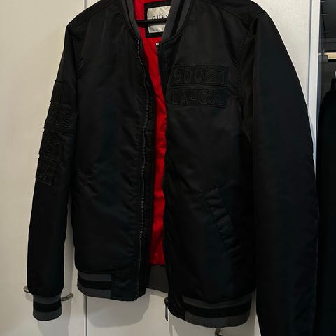 Guess miesten takki, koko S. Väri valkoinen mustilla yksityiskohdilla. Materiaali polyesteriä. Takissa on vetoketjukiinnitys edessä, vetoketjutaskut sivuilla sekä huppu, jonka takaosassa on Guess-logo. Soveltuu arki- ja vapaa-ajan käyttöön.