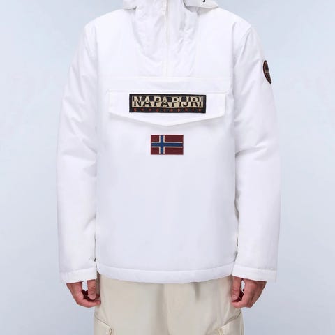 Napapijri Rainforest talvitakki valkoinen. Anorakkimallinen takki, jossa kiinteä huppu ja etupuolella suuri läppätasku. koko L
