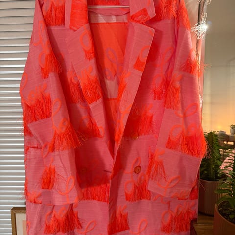 Kevyt tikkitakki, jossa hopeinen valoa heijastava pinta. Takissa taskut. Koko on onesize, mutta sopivin S/L kokoiselle.