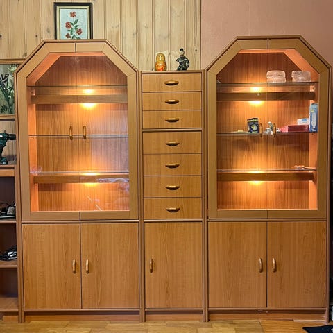 Puinen vitriinikaappi, jossa on kaksi ovea ja alaosassa kolme vetolaatikkoa. Kokonaisuus sisältää alasokkelin, lipaston ja päällä olevan kaapin puutasoilla. Ovet on koristeltu kukkakuvioisella kankaalla, ja vetimet ovat metallia.Lasiovien taakse on nastoilla kiinnitetty kukkakuvioiset kankaat, jotka voi halutessaan irroittaa,